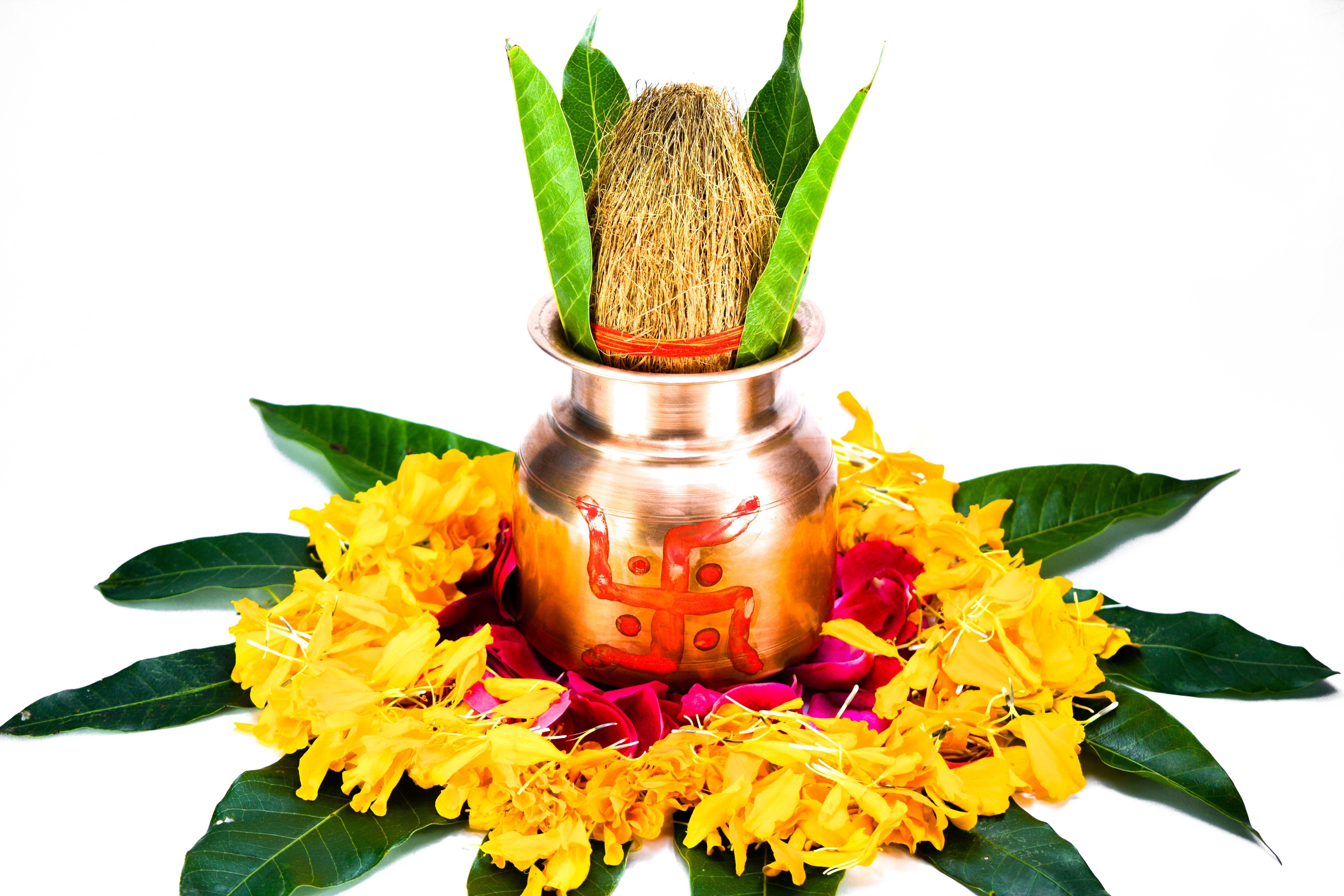 Copper kalash with coconut, mango leaf, and marigold flower isolated on white background