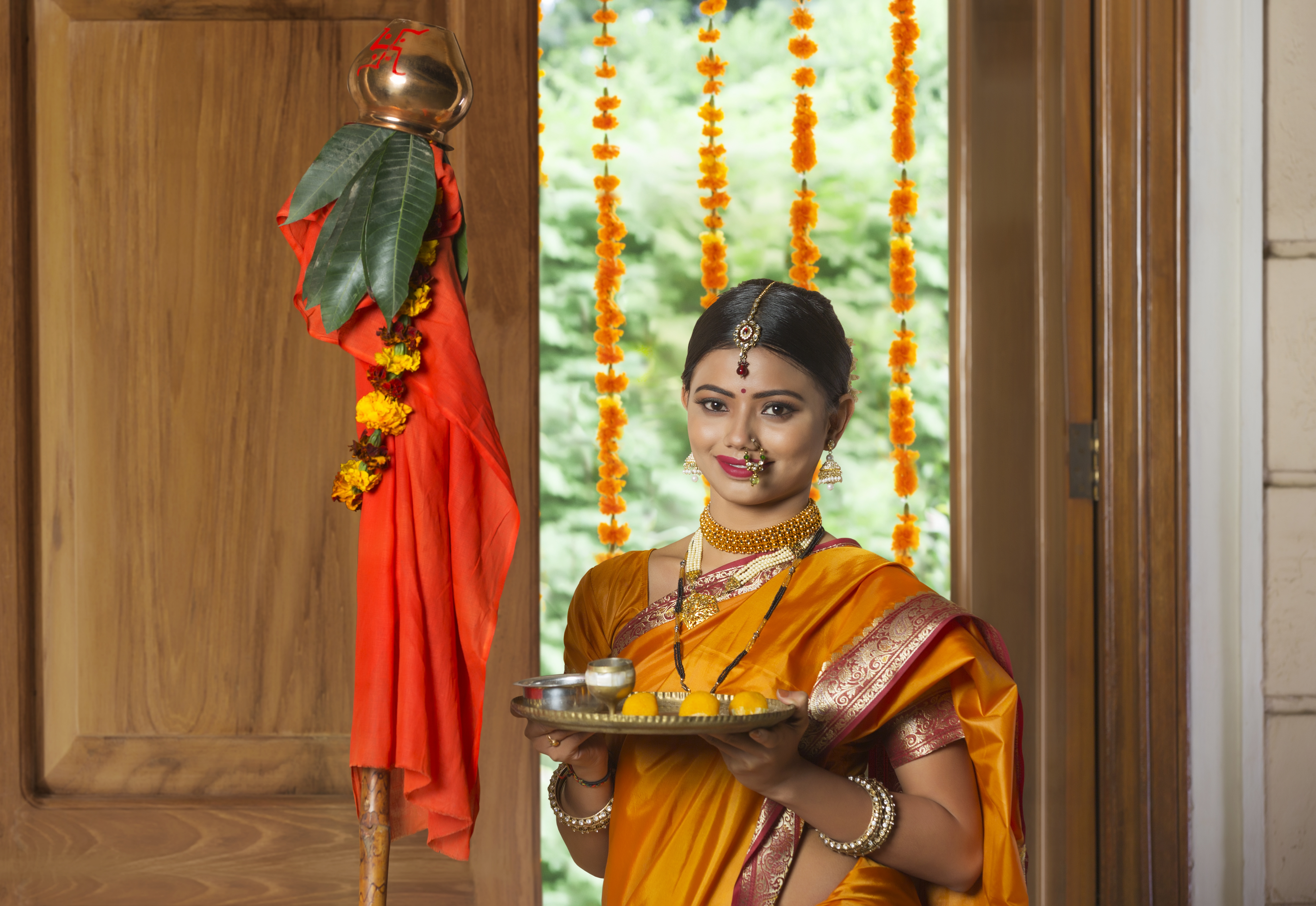 Portrait of a maharashtrian woman in traditional dress celebrating gudi padwa festival holding a pooja plate.