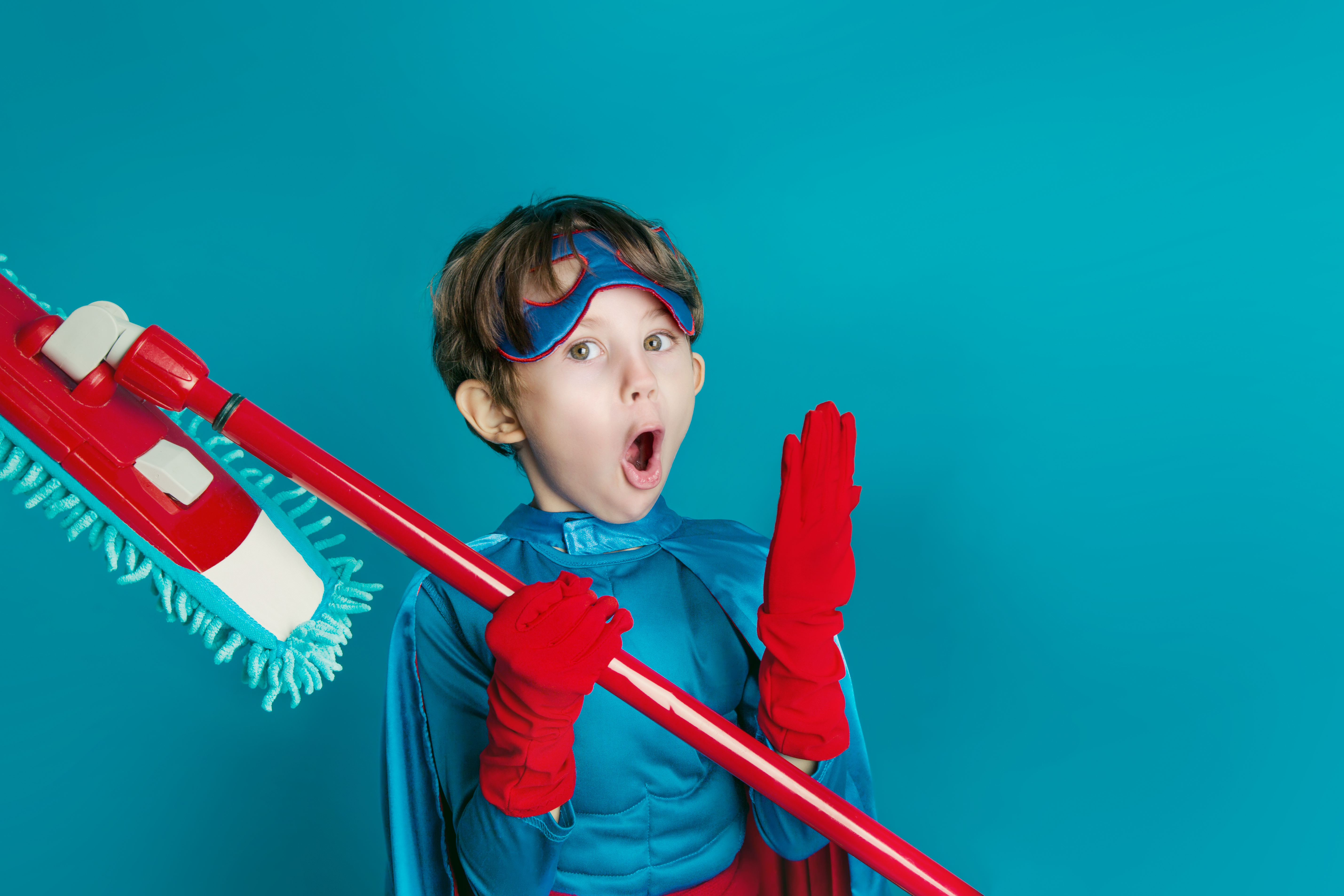 Portrait of young boy cleaning super hero hold mop on blue background