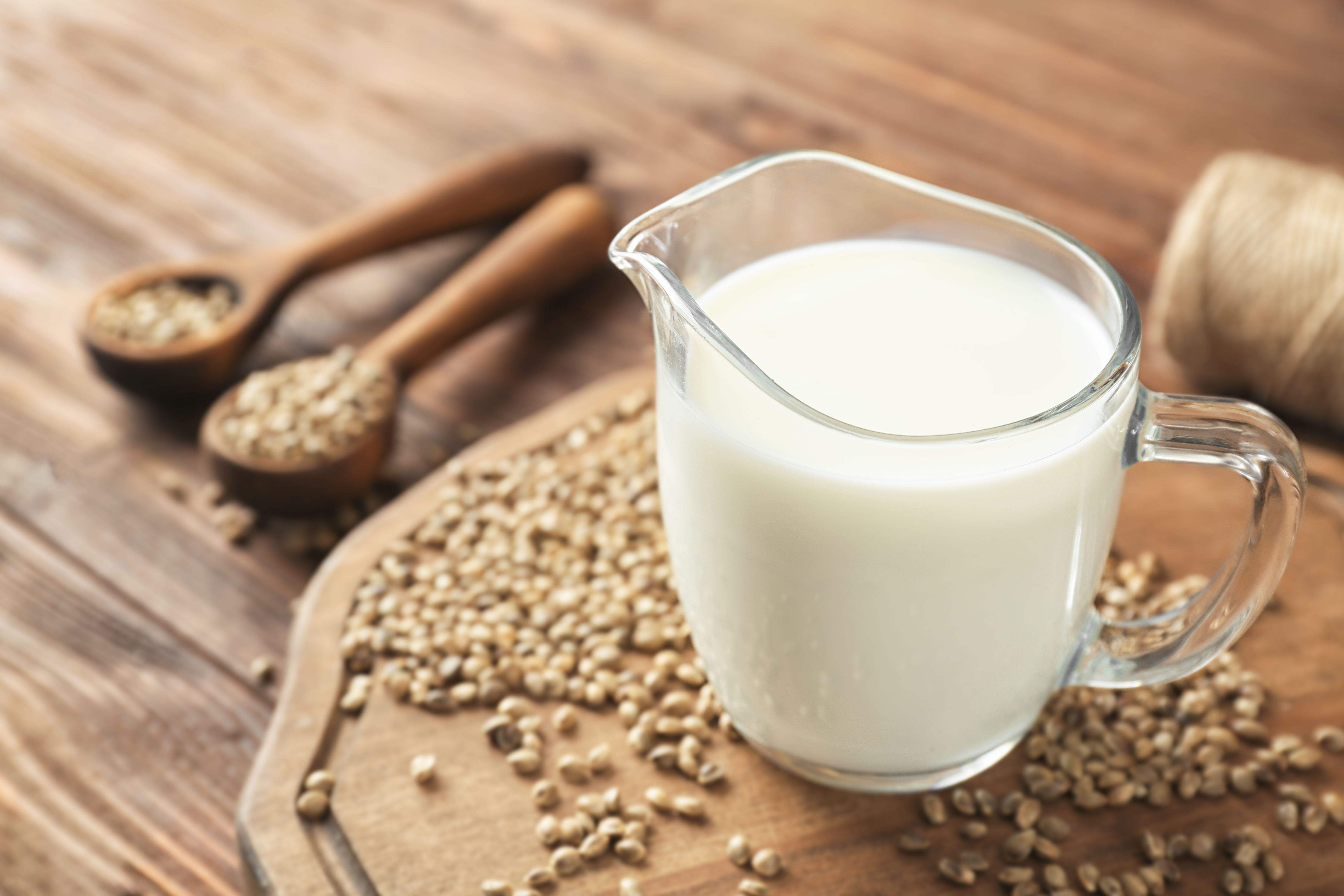 Jug with healthy hemp milk on wooden board