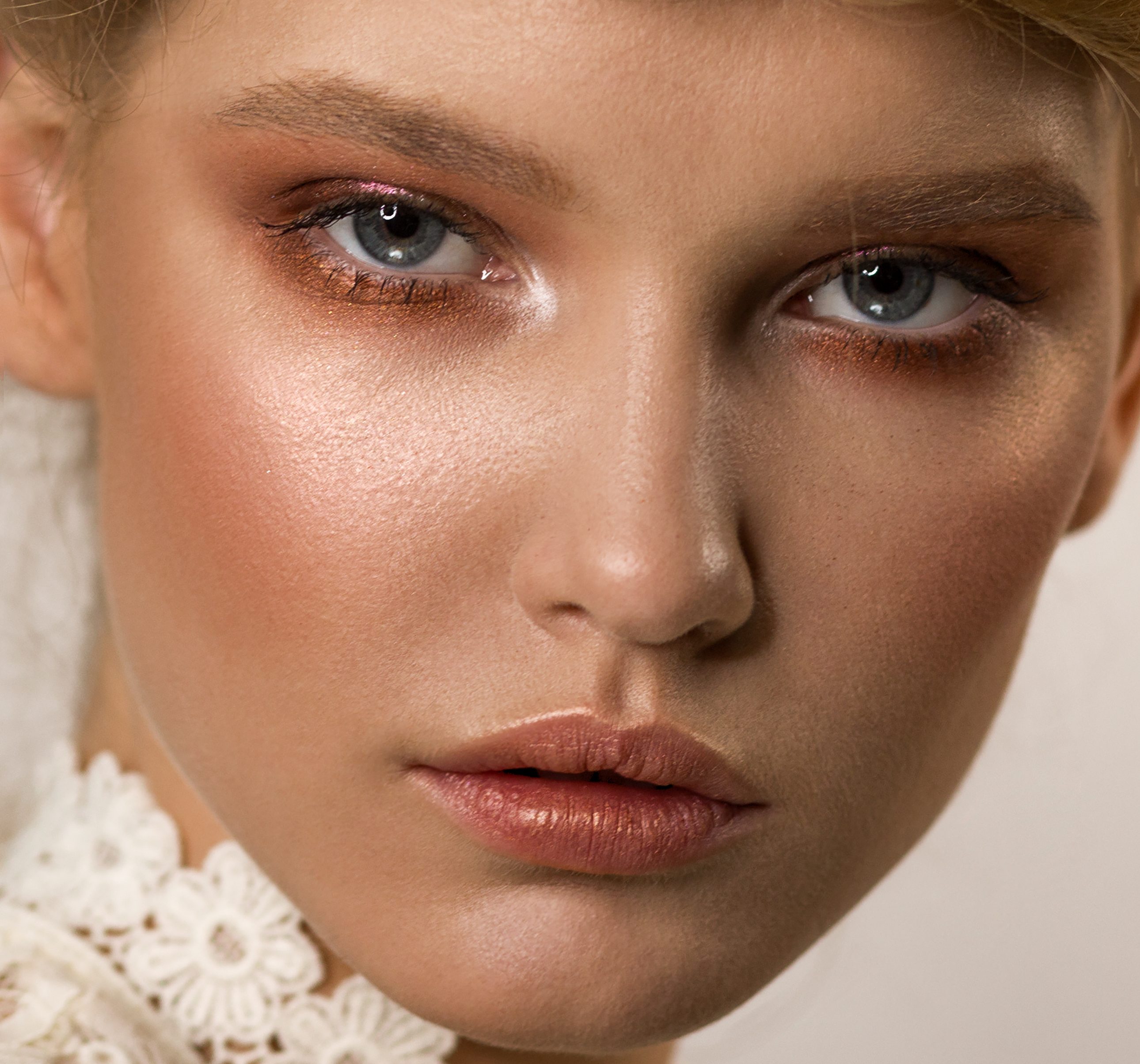 Close-up face of a woman with stylish makeup. Shades of bronze in the eyes. Beige lipstick with a golden lip gloss. Shining healthy skin. Highlighter. Fashion make-up.