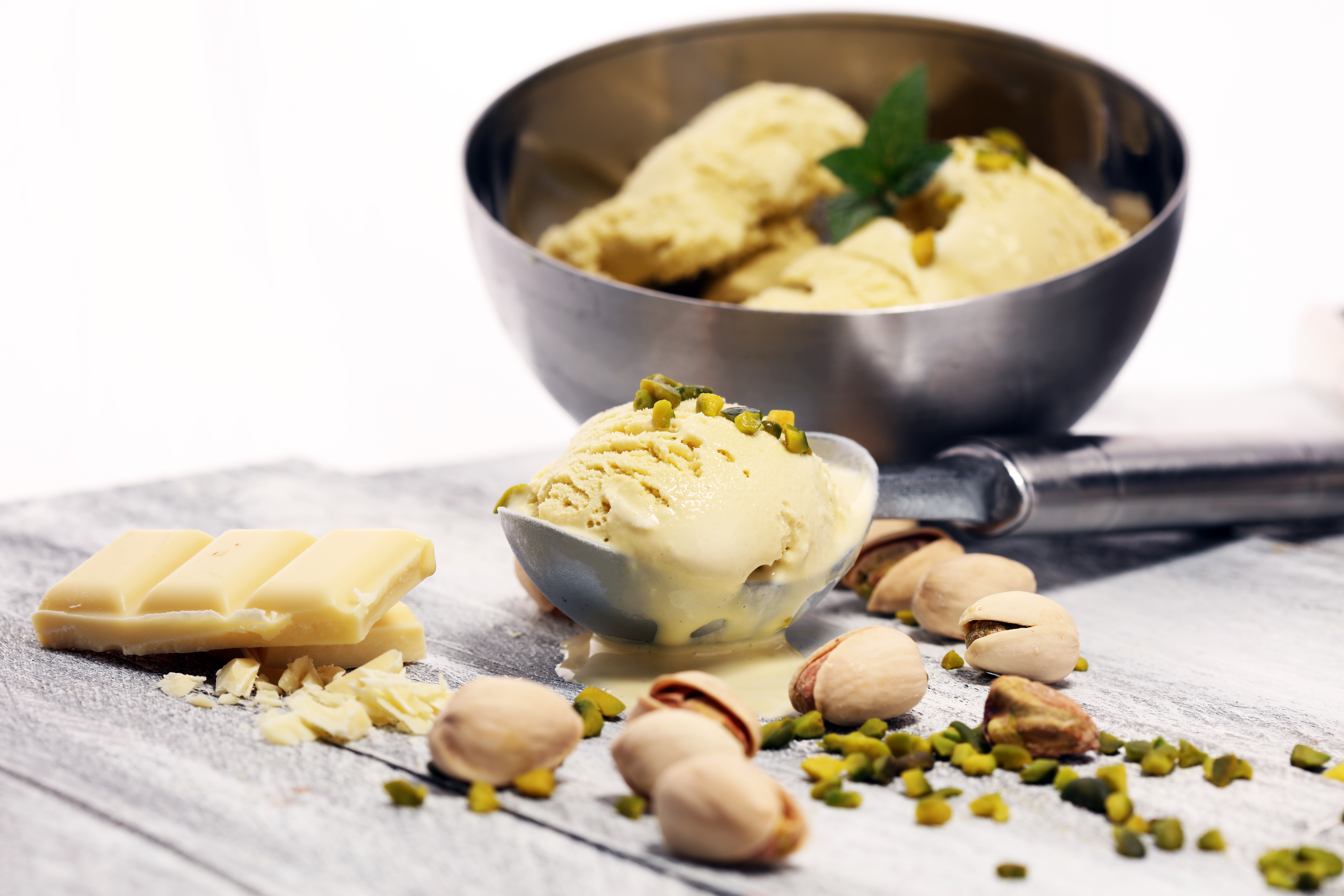 Pistachio ice cream scoop with chopped nuts and white chocolate on a rustic background