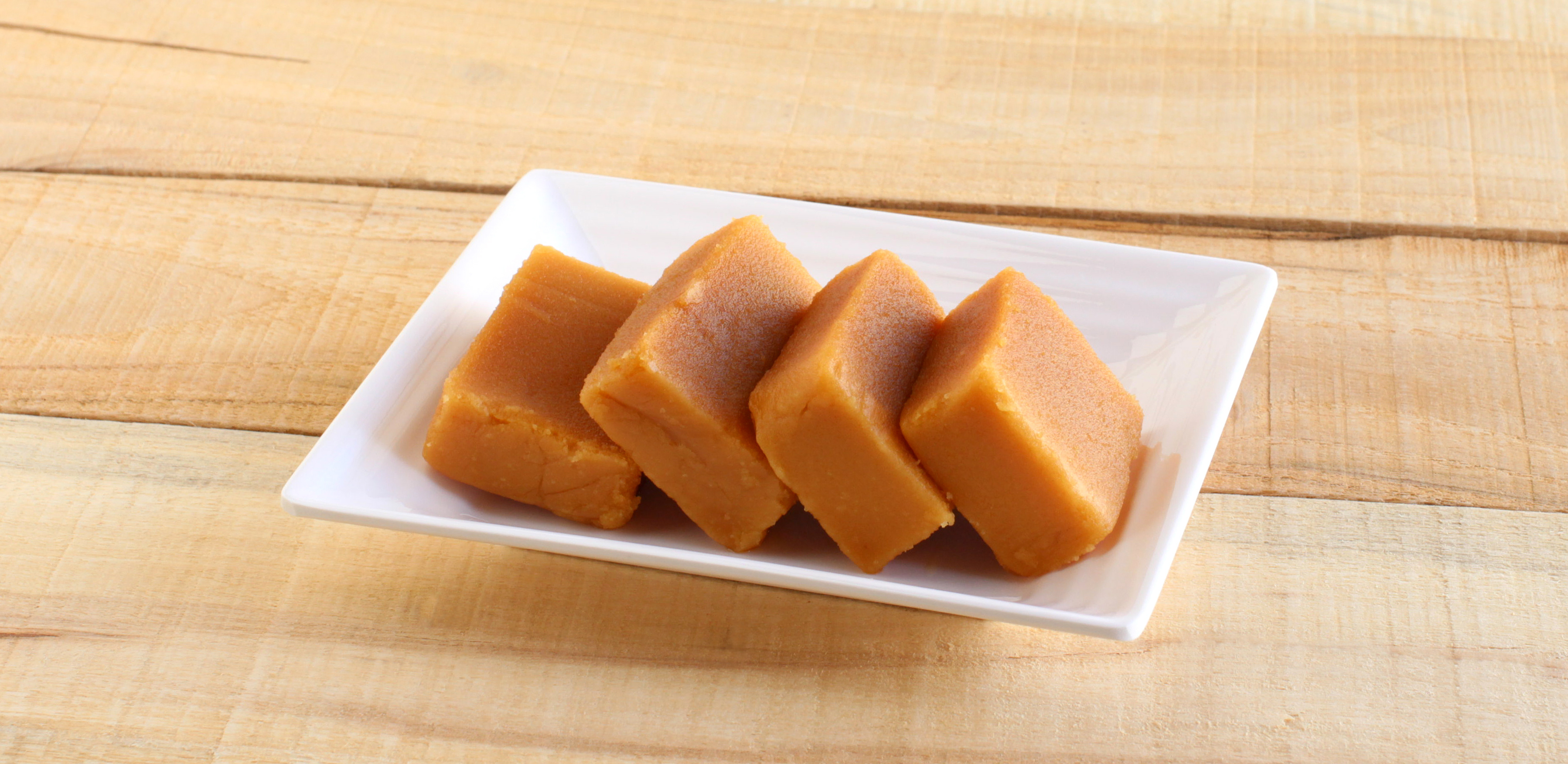 Mysore pak, a traditional, popular, and delicious sweet dish native to the city of Mysore, Karnataka, India, is made from ingredients like gram flour, ghee and sugar, on a ceramic plate.