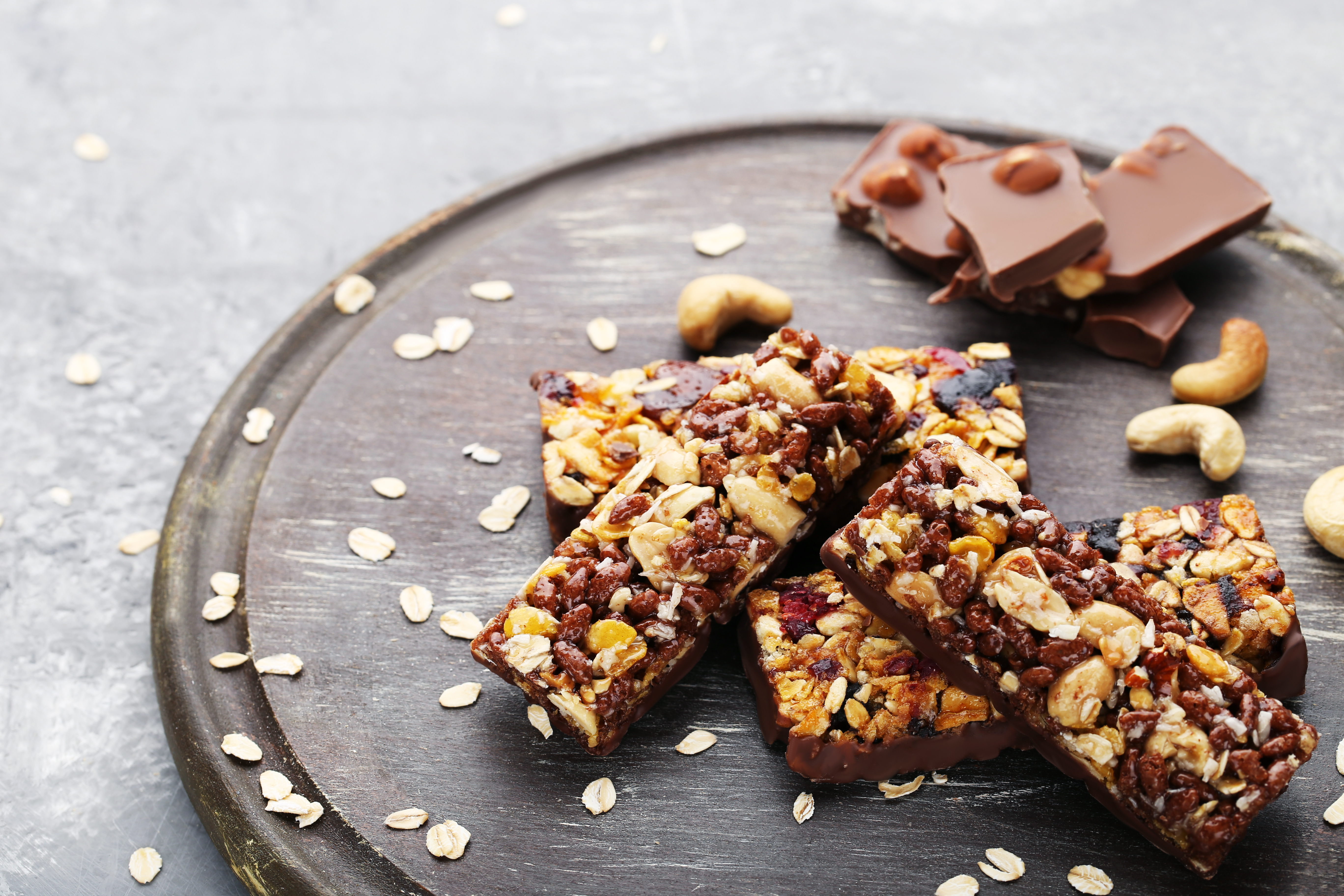 Granola bars with cashew and chocolate pieces on cutting board