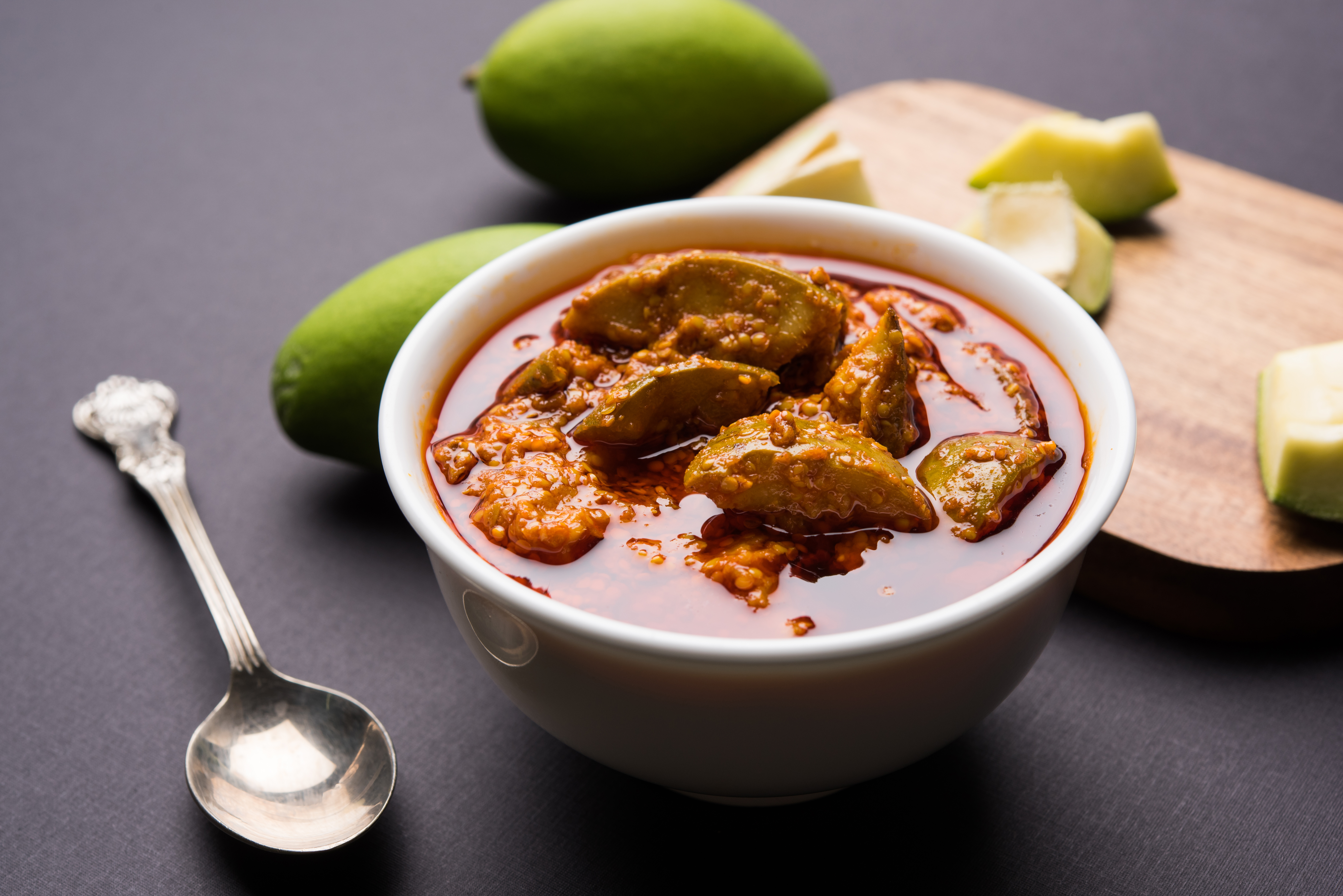 Homemade Mango Pickle or aam ka achar or achaar in white bowl, selective focus