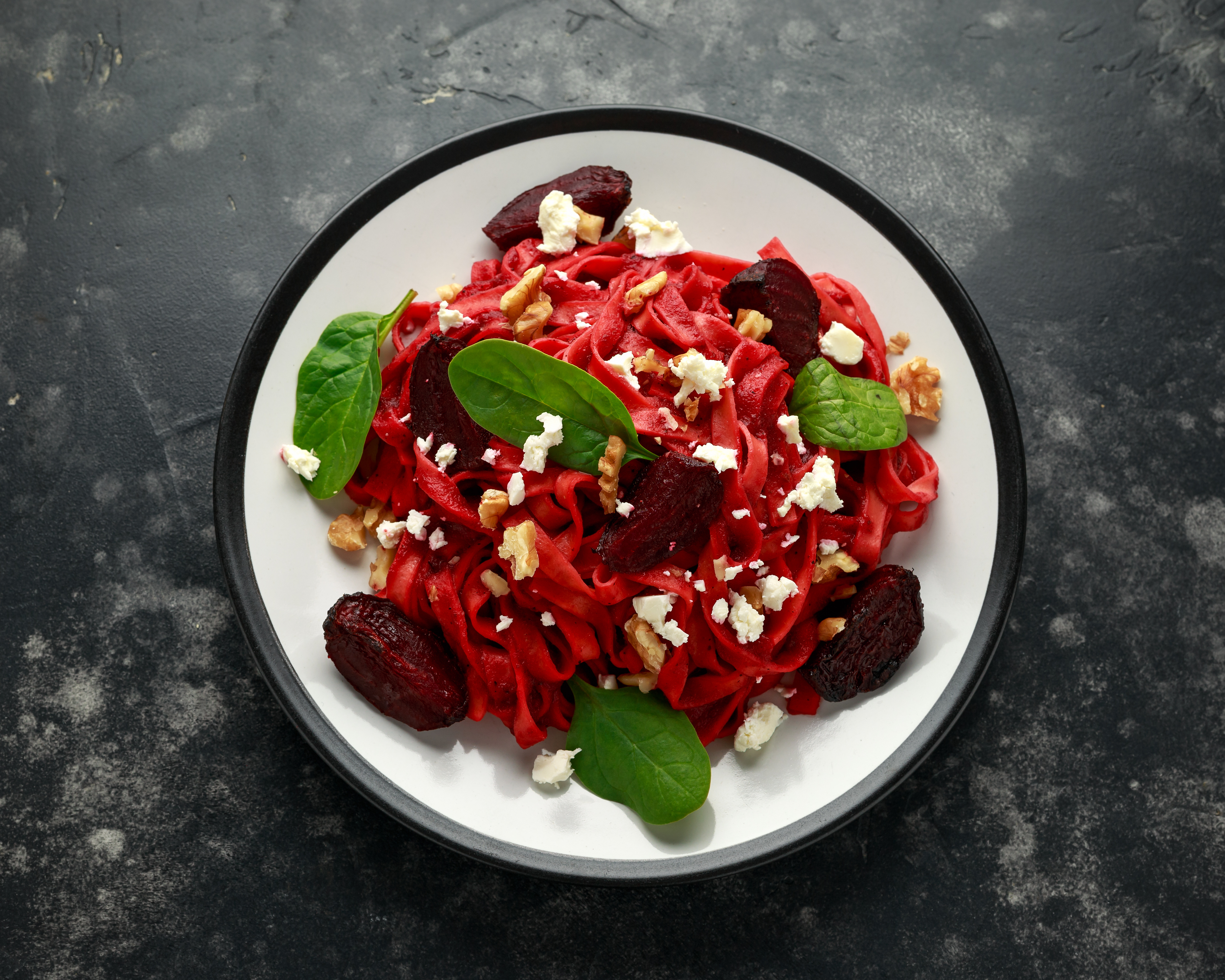 Roast Beetroot Pasta with spinach, walnuts and feta cheese. healthy food