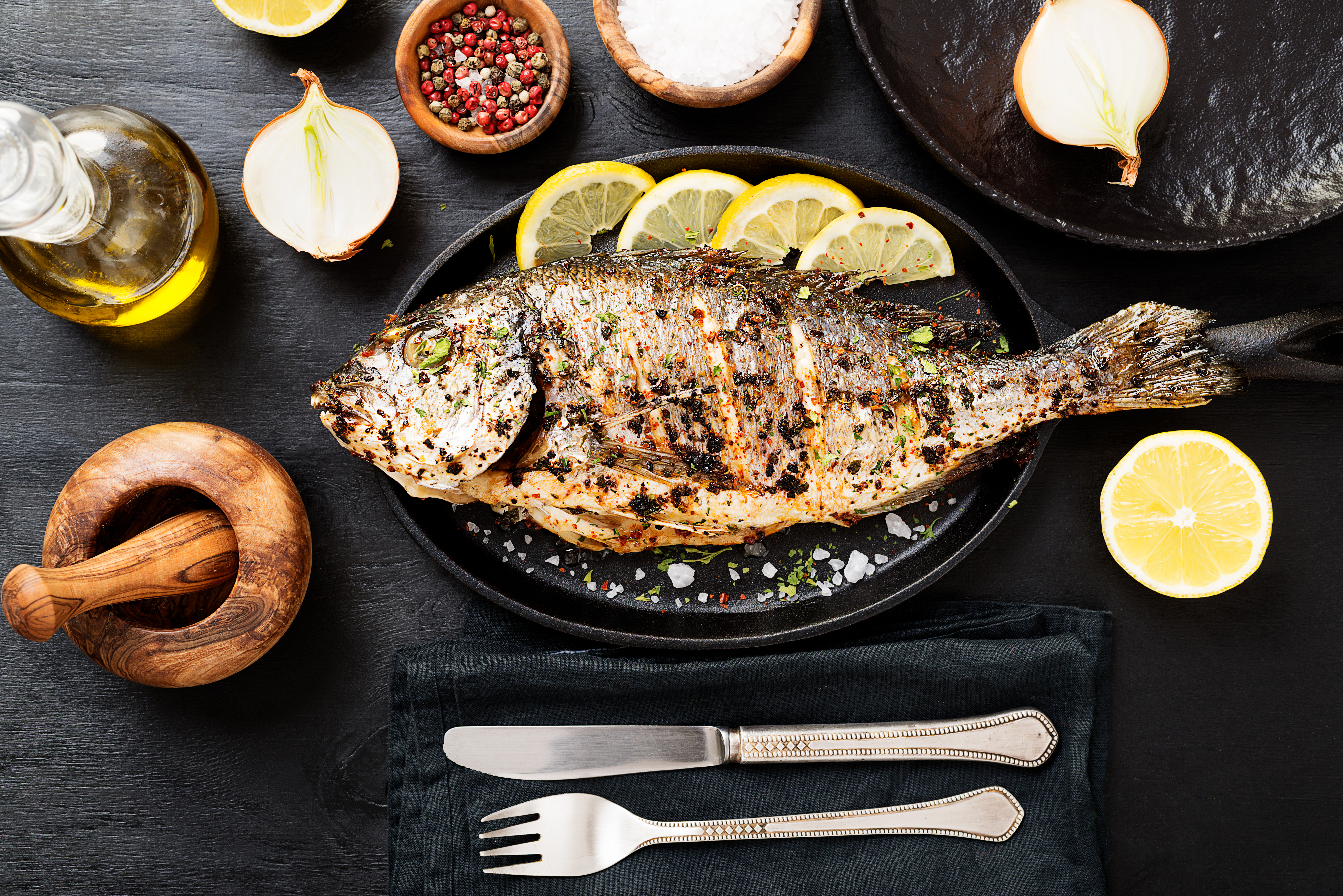 Tasty grilled fish dorado with lemon on kitchen table.
