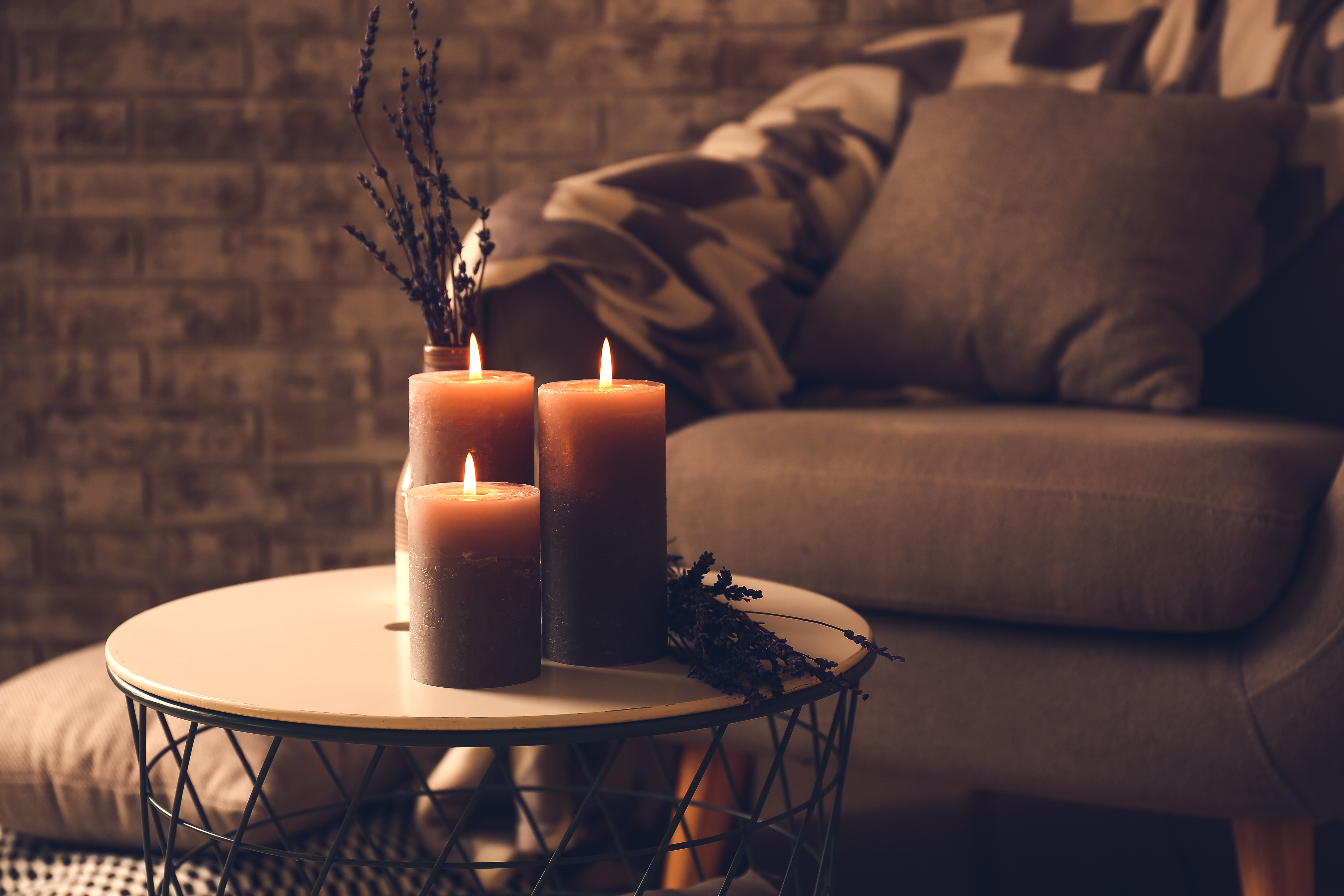 Beautiful aroma candles with lavender flowers on table in dark room