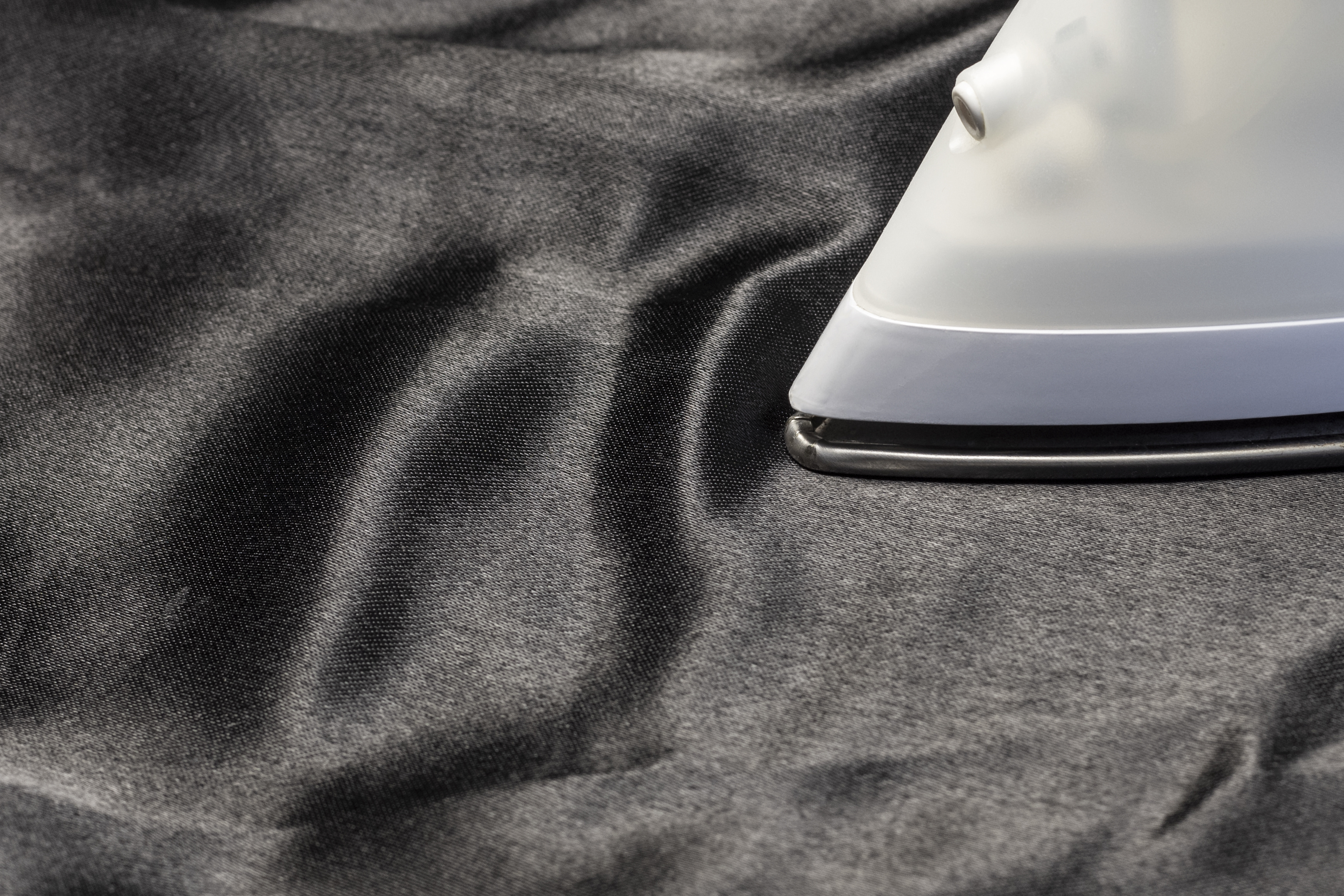Ironing of delicate smooth soft black silk fabric close-up.